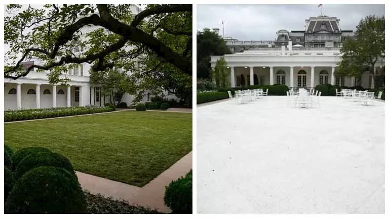 تغيّر شكل "حديقة الورود"، إحدى أشهر أيقونات البيت الأبيض، بعدما أمر الرئيس الأمريكي دونالد ترامب بإجراء تعديلات عليها. وكجزء من مبادرات التجديد المختلفة التي يقودها ترامب في البيت الأبيض، جرى استبدال القسم الأوسط من الحديقة، الذي كان مغطى تقليديًا بالعشب، ببلاط حجري، ووُضعت فوقه كراسي وطاولات فناء.