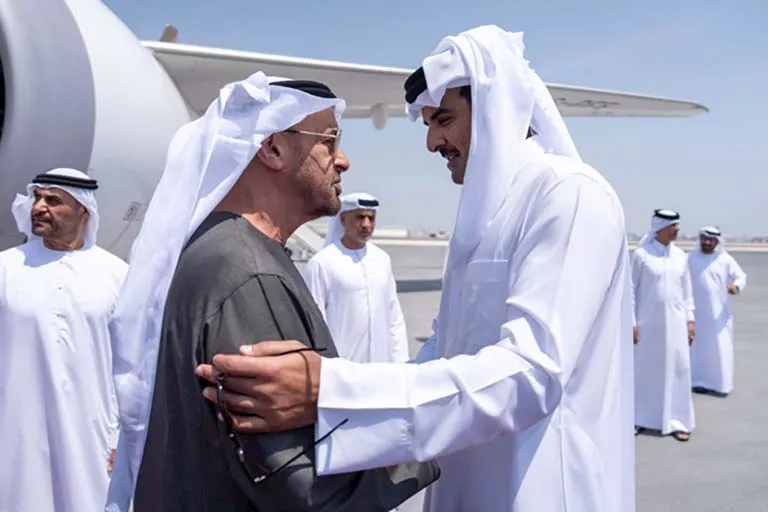 وكان أمير قطر الشيخ تميم بن حمد آل ثاني في مقدمة مستقبلي الشيخ محمد بن زايد آل نهيان والوفد المرافق لدى وصوله مطار الدوحة الدولي.