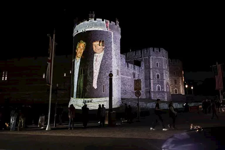 عرض نشطاء صورا للرئيس الأمريكي دونالد ترامب مع رجل الأعمال الراحل المدان باعتداء جنسي جيفري إبستين، وذلك خارج قلعة وندسور أمس الثلاثاء، قبل بدء فعاليات اليوم الأول من زيارة الرئيس الأمريكي التاريخية الثانية للمملكة المتحدة.