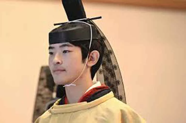 في القصر الإمبراطوري، ارتدى الأمير زيًا تقليديًا بلون البيج يرمز لمرحلة ما قبل البلوغ، ثم استبدل غطاء رأسه بالتاج الأسود الرسمي الذي يرمز إلى بلوغه سن الرشد. انحنى بعمق للإمبراطور شاكرًا له ولديه، وتعهد بتحمل مسؤولياته كعضو في العائلة الإمبراطورية.
