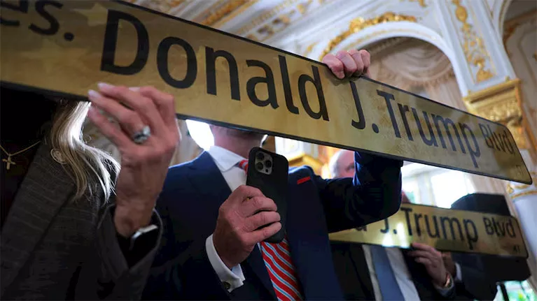 شهدت مقاطعة "بالم بيتش" بولاية فلوريدا، أمس الجمعة، مراسم تغيير اسم جزء من شارع "ساوثرن بوليفارد" إلى اسم الرئيس الأمريكي دونالد ترامب،