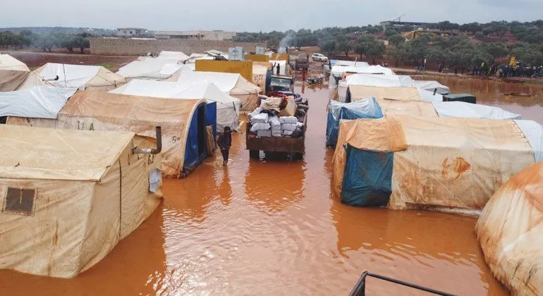 توفي ثلاثة أشخاص، طفلان ومتطوعة، وتضرر 14 مخيما جراء فيضانات مفاجئة ناجمة عن أمطار غزيرة شهدتها الليلة الماضية محافظات اللاذقية وإدلب وحماة في سوريا .