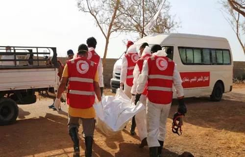 ونشر الهلال الأحمر صورا عبر الإنترنت تظهر المتطوعين وهم يضعون الجثث في أكياس بلاستيكية سوداء وينقلونها على متن سيارات بيك آب.