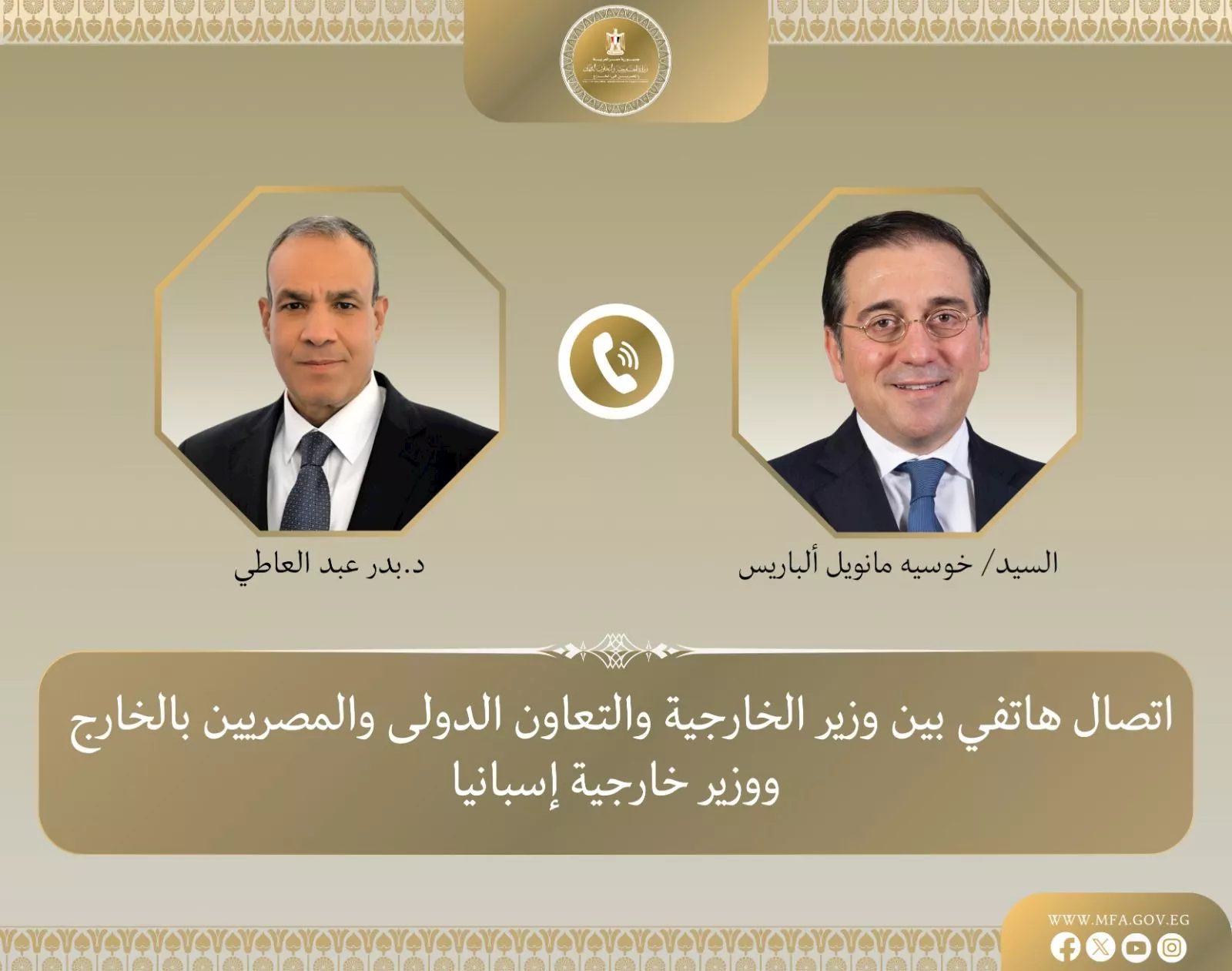 تلقى الدكتور بدر عبد العاطي، وزير الخارجية والهجرة وشئون المصريين بالخارج، اتصالا هاتفيا، اليوم الأحد 5 أبريل، من نظيره الإسباني خوسيه مانويل ألباريس، وذلك في إطار التنسيق المستمر لبحث تطورات الأوضاع الخطيرة التي يشهدها الإقليم وسبل تعزيز العلاقات الثنائية.