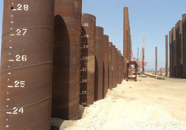 وأشار إلي أنه سيتم استخدام خوازيق معدنية بقطر 2 متر وطول 68 متر، بإجمالي 359 خازوق بوزن 25 ألف و350 طن، علي أن يتم تزويد الخوازيق بطبقات من الرمال ثم الخرسانة المعادية ثم الخرسانة المسلحة، لتجعل العمر الافتراضي للرصيف ما يقرب من 100 عام، موضحاً أنه يتم استخدام أوناش تبدأ من 90 طن حتي 300 طن، بعدد يبلغ (8) أوناش.