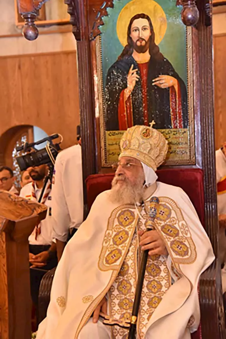 واستهل قداسة البابا زيارته بإزاحة الستار عن اللوحة التذكارية التي تؤرخ لتدشين الكنيسة، حيث استقبله طفل وطفلة قدما له باقات من الورود، قبل أن يتقدمه خورس الشمامسة بالألحان داخل الكنيسة وسط أجواء من الفرح والتفاعل الشعبي.