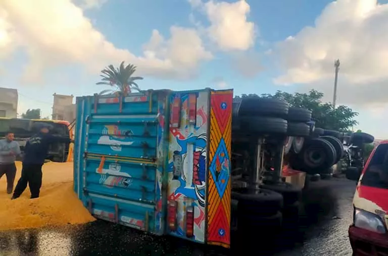 وفي سياق متصل، شهد الطريق ذاته انقلاب سيارة نقل ثقيل أخرى محملة بالغلال، على بعد أمتار قليلة من الحادث الأول، ما تسبب في سقوط حمولتها، وذلك دون حدوث وفيات أو إصابات.