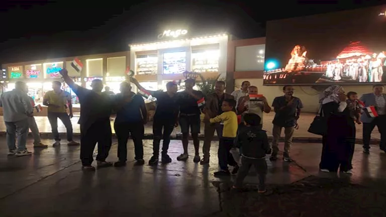 وتزينت ساحة السوق التجاري القديم بشرم الشيخ بالتماثيل التي تعبر عن حقبة تاريخية هامة في مصر، ورفع المواطنين والسائحين العلم المصري، مرددين " تحيا مصر".