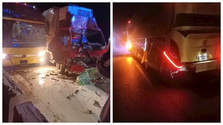 وانتقلت الجهات الأمنية لموقع الحادث، وأفادت المعاينة أن الحادث وقع نتيجة تصادم أتوبيس يحمل لوحات رقم "د ع ب 1543" مع أتوبيس رقم "د ع ب 3895" وسيارة نقل جامبو تلاجه رقم "د ن 4547" وسيارة نقل جامبو محملة دواجن.