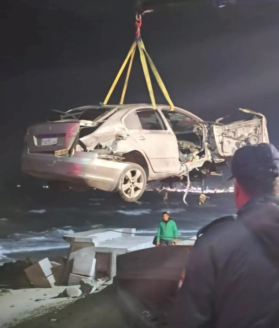 وكشفت المعاينة طيران السيارة في الهواء من شدة الاصطدام والسرعة وسقوطها من أعلى الكورنيش على شاطئ البحر وانقلابها بمستقليها الثلاثة، ما أدى إلى تحطمها وتصاعد دخان منها.