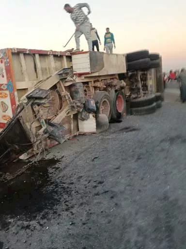 انقلاب سيارة نقل محملة بـ"بلوك" فوق كوبري طما العلوي في سوهاج