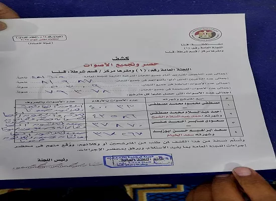 أعلنت اللجنة العامة للدائرة الأولى بمحافظة قنا، نتائج الحصر العددي لأصوات الناخبين في جولة الإعادة لانتخابات مجلس النواب، عقب الانتهاء من أعمال الفرز باللجان الفرعية وتجميع النتائج.