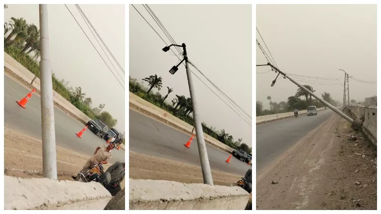 تسببت الرياح النشطة المحملة بالأتربة، مساء الإثنين، في سقوط عمود إنارة على الطريق الزراعي (القاهرة – أسيوط) أمام عزبة عويس التابعة لمركز بني سويف، ما أدى إلى تعطل مؤقت في حركة المرور.