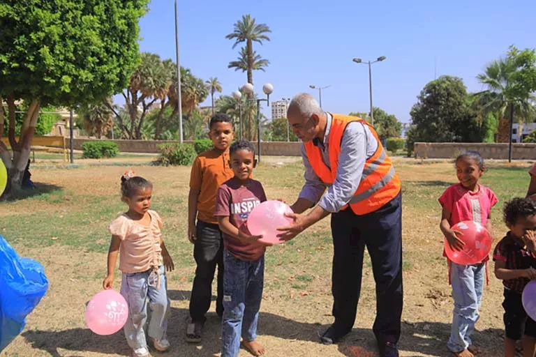 في لمسة بهيجة، قام العاملون بإدارة الحدائق العامة بالمحافظة، بقيادة المهندس محمد حسن، بتوزيع الهدايا والبالونات والألعاب على الأطفال المتوافدين.