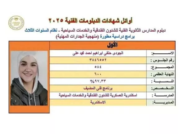 وفي سياق متصل، جاءت نتائج الطلاب المتفوقين لتجسد مستوى التميز والجدية في هذا القطاع، حيث حصلت الطالبة الجودي حنفي إبراهيم أحمد، من مدرسة إسكندرية للشئون الفندقية والخدمات السياحية التابعة لإدارة وسط التعليمية، على المركز الأول على مستوى الجمهورية بمجموع 97.3%، كما حصدت الطالبة آمال وجدي يوسف الصفتى، من مدرسة أمبروزو الثانوية الصناعية المهنية بنات بنفس الإدارة، المركز الأول على مستوى الجمهورية بمجموع 94.6%.
