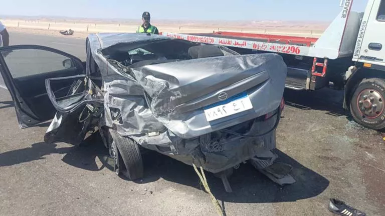 واصطدمت السيارة بالحاجز الخرساني الفاصل بين الطريق والمنطقة الصحراوية، وتم رفعها باستخدام ونش خاص، وإخلاء الموقع من آثار الحادث.