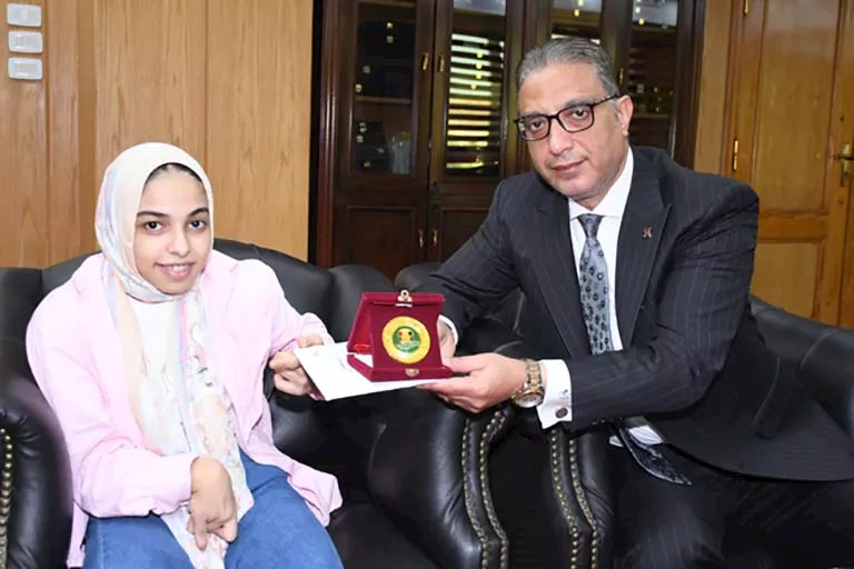 مي طاهر تتحدى الإعاقة واليُتم وتتفوق في الثانوية العامة.. ومحافظ الفيوم يكرمها