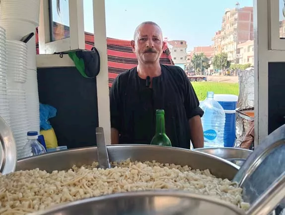 "اللي يكسب قلوب الناس يرزق".. حكاية بائع كشري يجر عربة خشبية في قرى منيا القمح