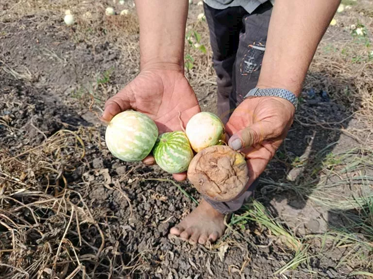 وقال علي سعد محبوب، مزارع، إنه بعد 90 يومًا من العمل المتواصل منذ بدء زراعة بطيخ اللب في مايو وحتى أغسطس الجاري، تعرض محصوله للتلف نتيجة ارتفاع درجات الحرارة، رغم اقترابه من مرحلة الحصاد وتسويقه لتجار الحبوب الذين أبرم معهم اتفاقيات توريد مسبقة.