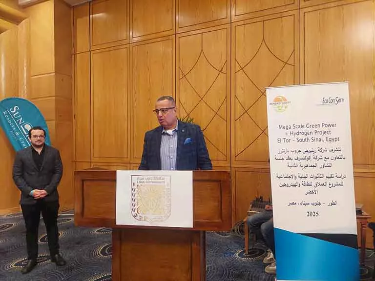 انطلقت اليوم الأحد، فعاليات الجلسة التشاورية لدراسة تقييم التأثيرات البيئية والاجتماعية لمشروع طاقة الهيدروجين الأخضر بشرم الشيخ، بحضور اللواء خالد مبارك، محافظ جنوب سيناء، وفرانس فام، رئيس مجلس إدارة الشركة المنفذة للمشروع، و أمجد محمد الحويني، رئيس قطاع الدراسات والبحوث، وكريم عمارة، استشاري المشروع.