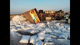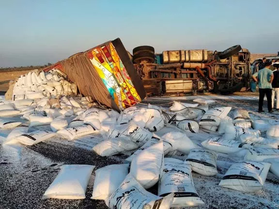 بالصور- انقلاب تريلا محمّلة بالأسمدة الزراعية على طريق الفيوم