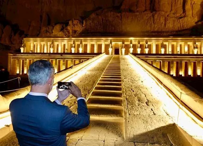 والتقط الملك وقرينته - خلال الزيارة - صور "سيلفي" في قلب معبد الملكة حتشبسوت بالدير البحري، وشهدا الإطلاق التجريبي لمشروع الإضاءة الليلية للمعبد التاريخي في أحضان جبل القرنة، وسط أجواء احتفالية أبهرت الحاضرين.