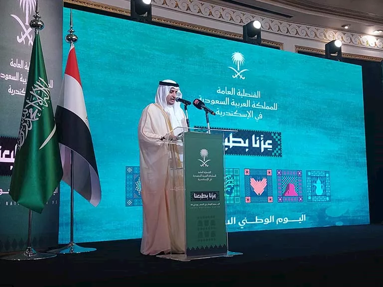 جاء ذلك خلال كلمته، اليوم الثلاثاء، في احتفال القنصلية باليوم الوطني الـ95 للمملكة، بحضور الفريق أحمد خالد، محافظ الإسكندرية، والدكتور عبد العزيز قنصوة، رئيس جامعة الإسكندرية، والدكتور أحمد زايد، مدير مكتبة الإسكندرية.