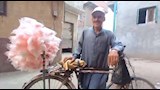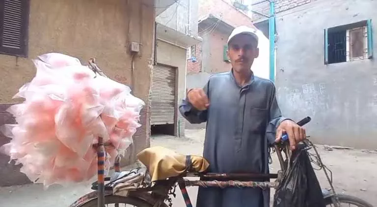 بدراجة هوائية مهترئة وجلباب داكن اللون، يجوب جابر عمر، 42 عامًا، شوارع مركز الشهداء في المنوفية، وعلى رأسه قُبّعة بسيطة تحميه من أشعة الشمس الحارقة، مناديًا على غزل البنات، يبيع ثلاثة أكياس بخمسة جنيهات.