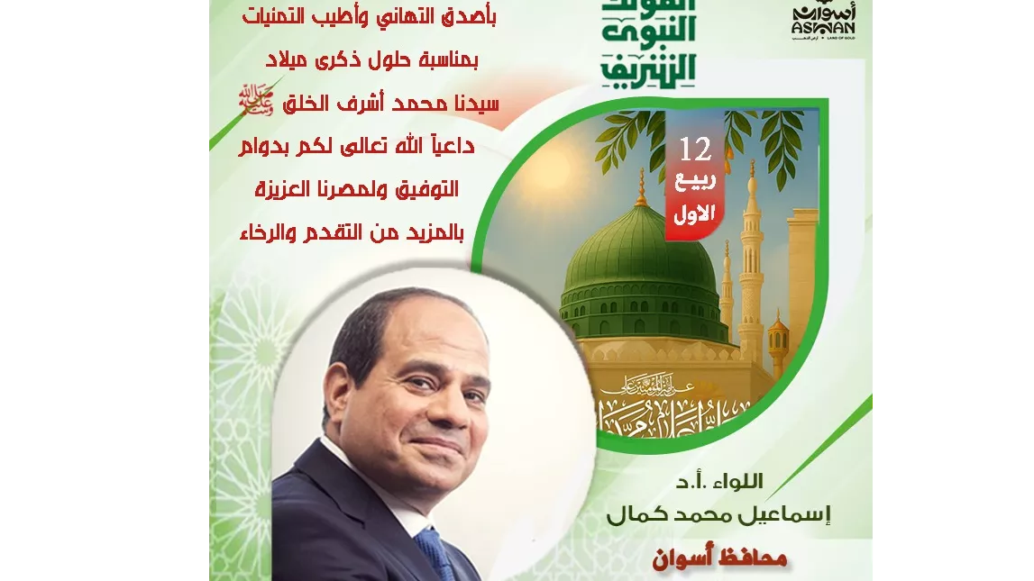 محافظ أسوان يهنئ الرئيس السيسى بذكرى المولد النبوي