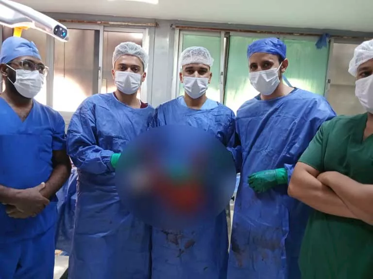 وأضاف أنه تم إجراء عملية استكشاف بمنطقة البطن عن طريق شق وسطي وتبين وجود ورم كبير بالقولون الصاعد وجزء من القولون المستعرض، حيث تم فك الالتصاقات وفصل الورم عن الاثني عشر والمرارة والقناة المرارية وجدار البطن وعمل فتحة تحويل مجرى البراز، موضحا أن حجم الورم يزن 7 كيلو جرامات وأن وقت العملية استغرقت ثلاث ساعات.
