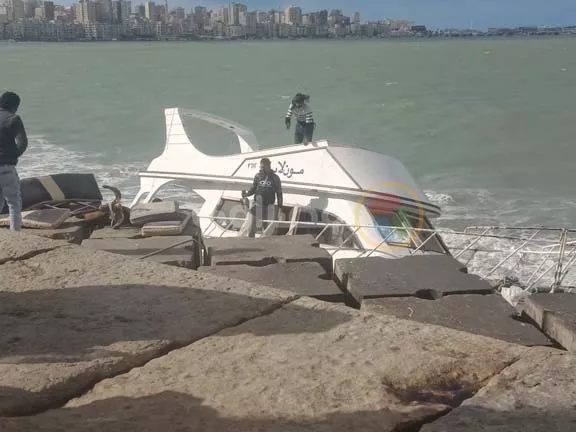 أمواج "الفيضة الكبرى" تقذف بمركب على صخور شاطئ محطة الرمل بالإسكندرية -صور