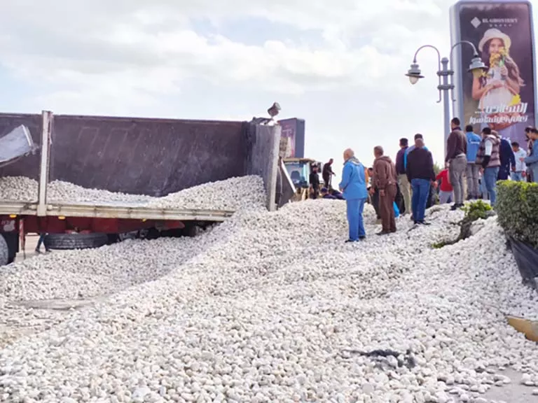 انتقل ضباط القسم والمرور وقوات الحماية المدنية رفقة سيارات الإسعاف إلى موقع البلاغ، وتبين من الفحص انقلاب سيارة نقل ثقيل وحمولتها بالكامل من "الزلط" بالطريق المشار إليه.