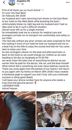 تداول عدد من رواد مواقع التواصل الاجتماعي خلال الساعات الماضية منشورًا لسائحة أجنبية تدعى Angelina FN، أشادت فيه بموقف إنساني لشاب مصري يدعى أشرف حسن بمدينة الأقصر، بعد تعرضها لحادث أثناء رحلتها السياحية.
