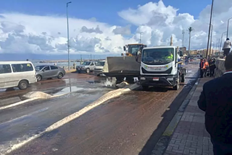 تلقت غرفة عمليات حي العجمي شكوى تفيد وجود كمية كبيرة من الملح بطريق المكس، وانتقلت نور الهدى محمد، رئيس الحي وإدارة الرصد البيئي إلى موقع البلاغ.