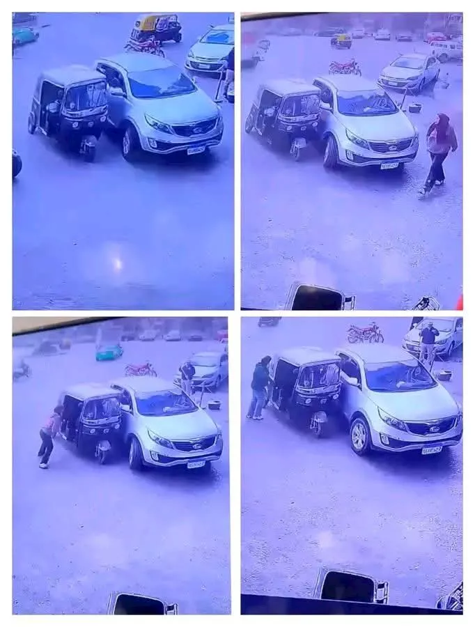 أظهر الفيديو لحظة احتكاك بين سيارة ملاكي وتوك توك، قبل أن تنزل الفتاة من السيارة وهي تحمل آلة حادة يُشتبه أنها ساطور، وتبدأ في الاعتداء على السائق الذي لم يغادر مركبته.