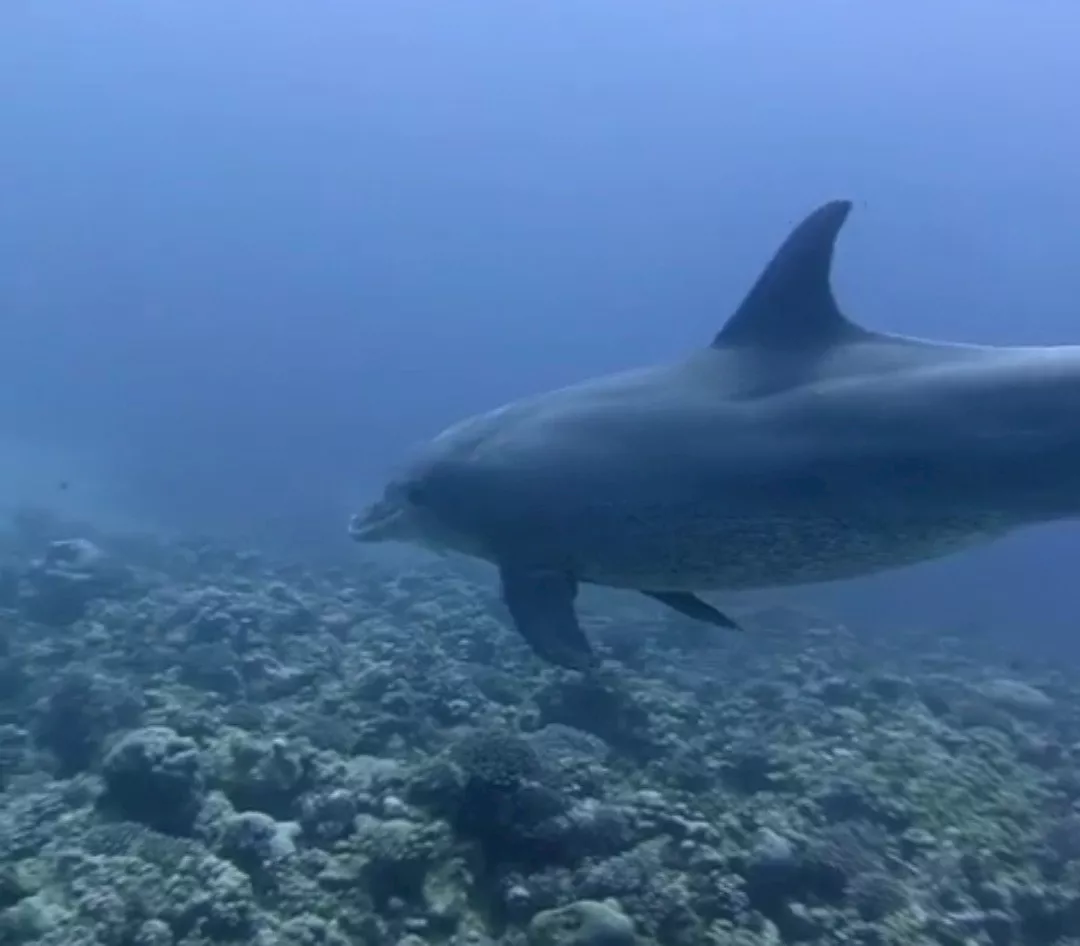 شاهد مجموعة غطاسين بمدينة دهب بمحافظة جنوب سيناء، دولفين ضخم على عمق 20 مترًا من سطح البحر بالقرب من منطقة البلوهول، اليوم خلال رحلة غطس في قاع البحر.