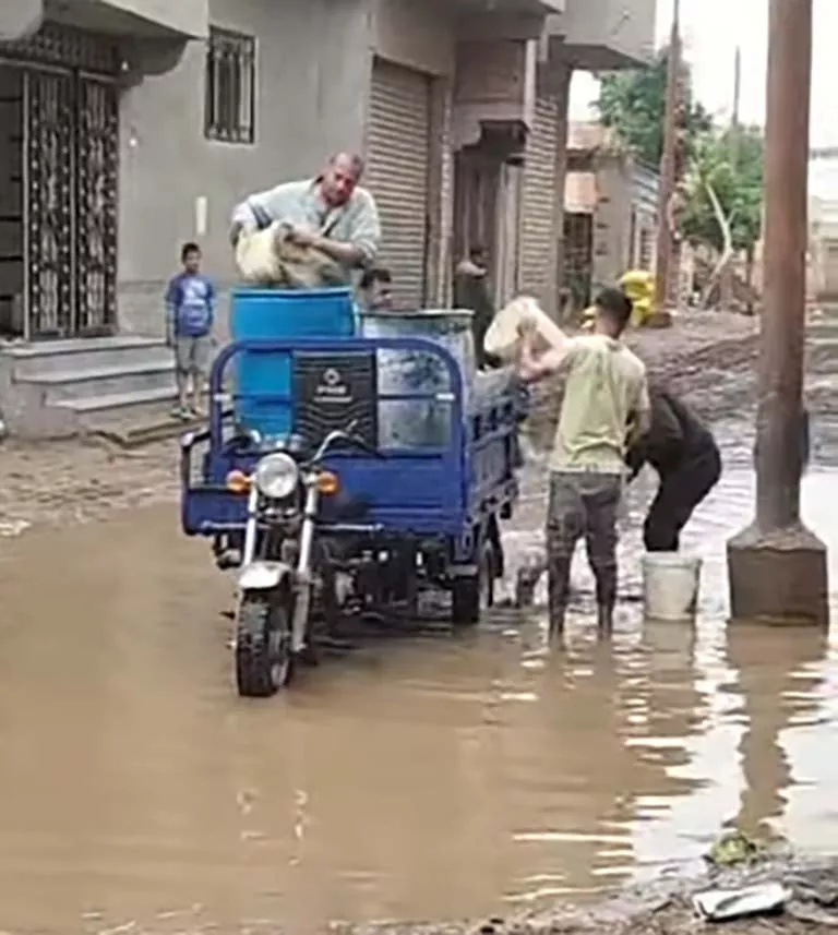 استخدم الأهالي أدوات بسيطة ومعدات بدائية للمساهمة في رفع تجمعات المياه عن الشوارع والمداخل، خاصة في المناطق الأكثر تأثرًا بالأمطار، لتسهيل حركة المواطنين والمركبات وضمان سلامتهم.