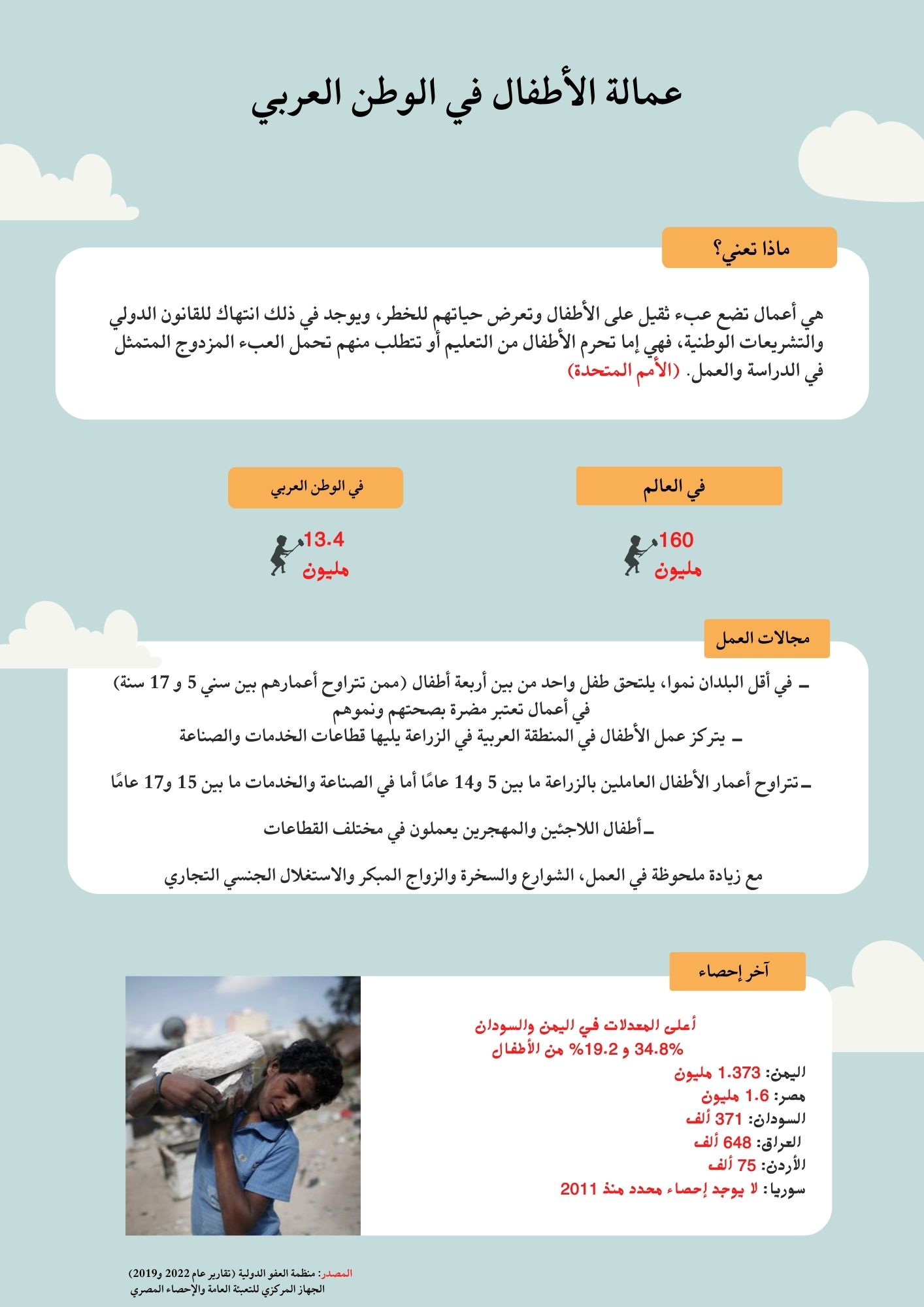 وتأتي الدول العربية في المرتبة الرابعة من حيث الإحصاءات المتاحة لعدد عمالة الأطفال، ونستعرض فيما يلي أبرز الأرقام عن عمل الأطفال في عالمنا العربي.