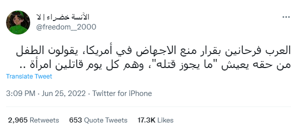 إحدى الحسابات على موقع تويتر هاجمت فرحة العرب بإلغاء حق الإجهاض، انتصارًا لعدم إزهاق روح، في المقابل فإن القتل يحدث بالفعل في المجتمعات العربية، مثل قضية مقتل الطالبة المصرية نيرة أشرف، وقضية مقتل الطالبة الأردنية إيمان إرشيد، وقتل الاثنين على يد رجال.