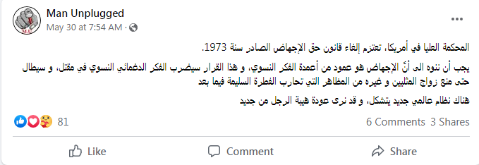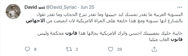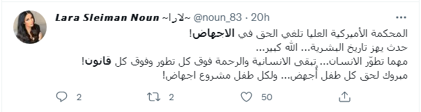 وحساب آخر هاجم المهتمات من النساء العربيات بالتعليق على القرار الأمريكي، في المقابل لم تحصلن بعد على أبسط الحقوق في مجتمعاتهن العربية، ومنوهًا بأن إلغاء القانون كان على يد محكمة.