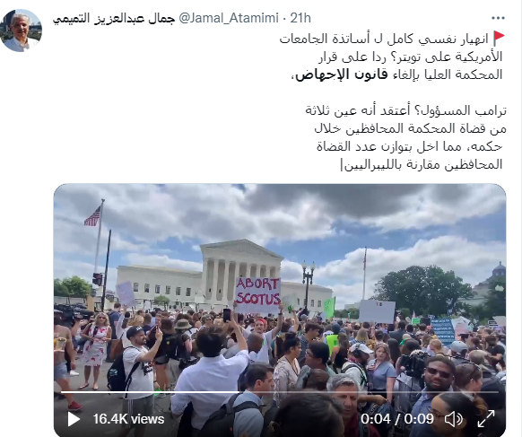 حساب آخر فسر ظروف إلغاء قانون الإجهاض، وأشار بأن المسئولية تقع على الرئيس الأمريكي السابق دونالد ترامب، الذي نجح في جعل أغلبية قضاة المحكمة العليا للمحافظين مقابل عدد أقل من القضاة الليبراليين.