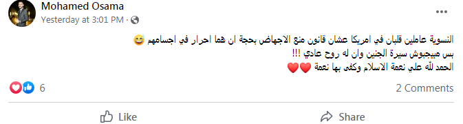 وأيد آخر إلغاء قانون الإجهاض حتى لا يتم إزهاق روح بحجة حرية الجسد، مشيرًا إلى أن الدين الإسلامي يحميه من مثل هذه النزاعات.