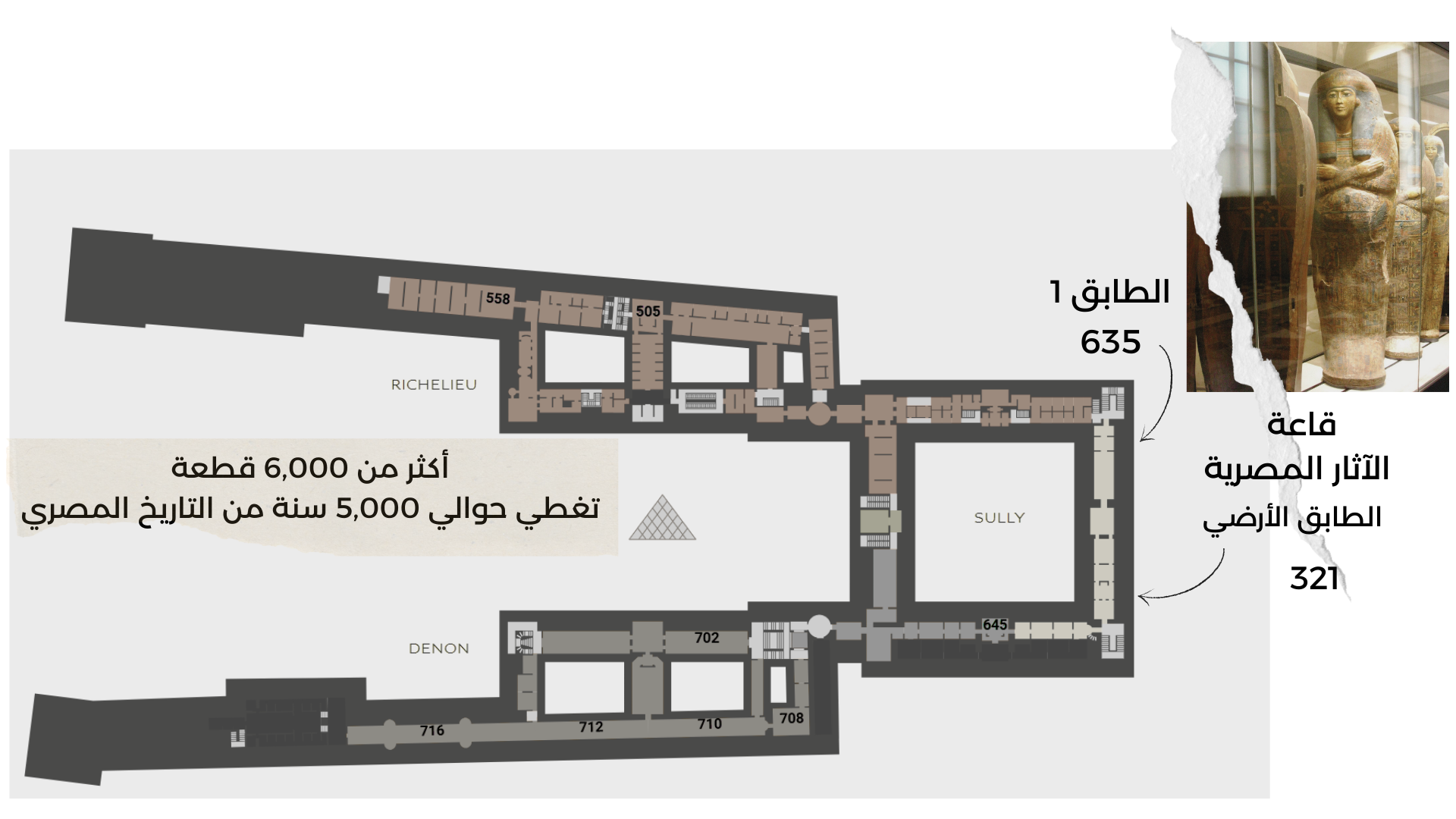 تقرر أن يكون مقر القسم الجديد في سلسلة من تسع غرف في الطابق الأول على ضفة نهر السين من القصر، فيما يُعرف الآن بجناح سولي. كانت هذه الغرف في الأصل شققًا للملكة قبل أن تُصبح مقرًا للأكاديمية الملكية للهندسة المعمارية، وأخيرًا لمجموعات الآثار المصرية.