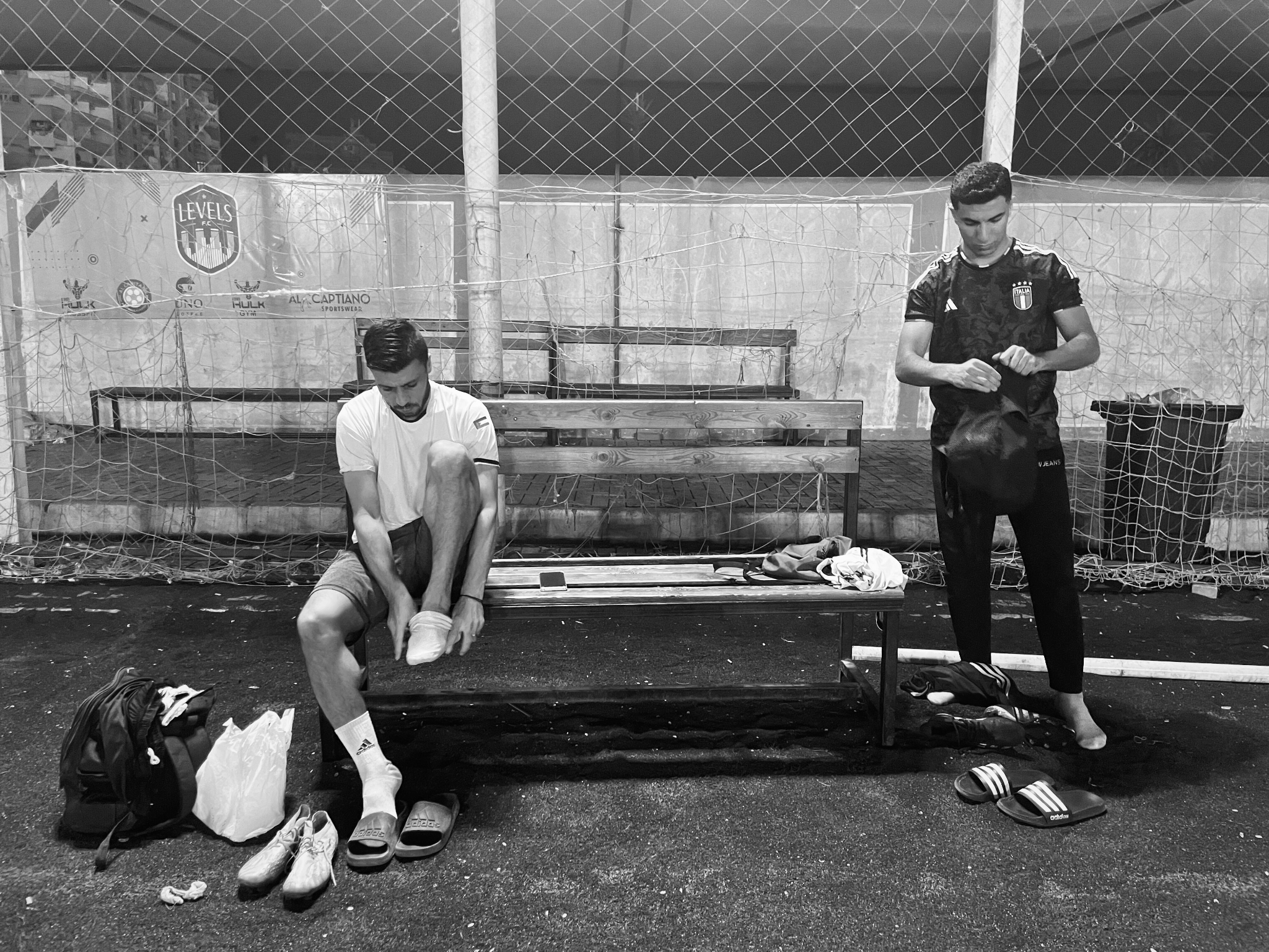 ينهض كل من "حجاج" و"عبدربه" مع صافرة العودة إلى شوط آخر، يحاول الأول أن ينفصل عما يجري، أن يتناسى حكيهما وبيوتهما المدمرة وأن إخوته ما زالوا هناك، كما كان يفعل في غزة دائمًا ليصب تركيزه في اللعب، بعكس "عبدربه"، الذي تسيطر عليه أفكاره.