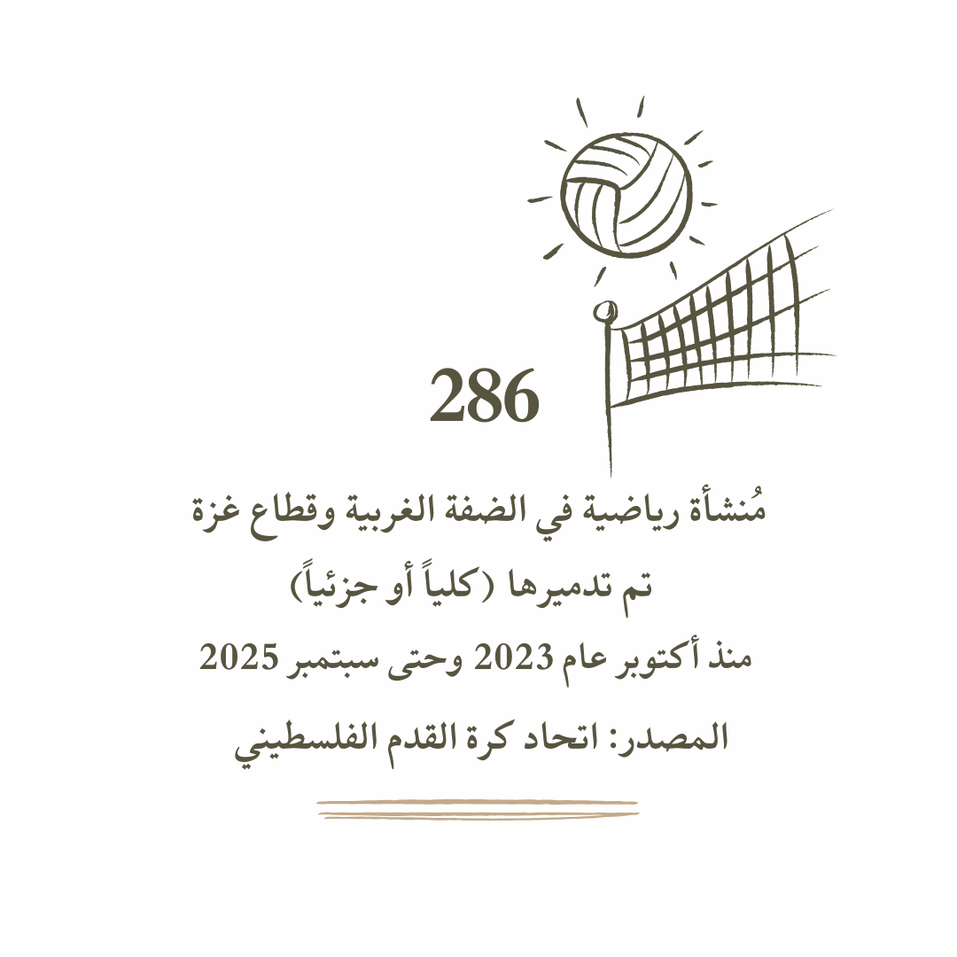 فقد دُمرت أغلب ملاعب غزة، وتحول بعضها إلى مراكز إيواء، وذلك بعد أن كانت غزة تضم عشرة ملاعب رياضية، حيث كانت الرياضة متنفسًا لمعظم السكان في ظل حصار خانق لأكثر من 16 عامًا.