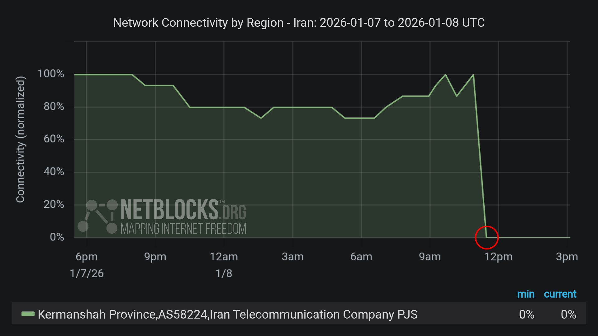 وتظهر بيانات الاتصال بالإنترنت أن الاستخدام في إيران انخفض بداية من 8 يناير الجاري، ثم انقطع تماماً في الأيام الأخيرة.