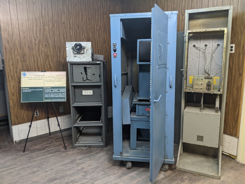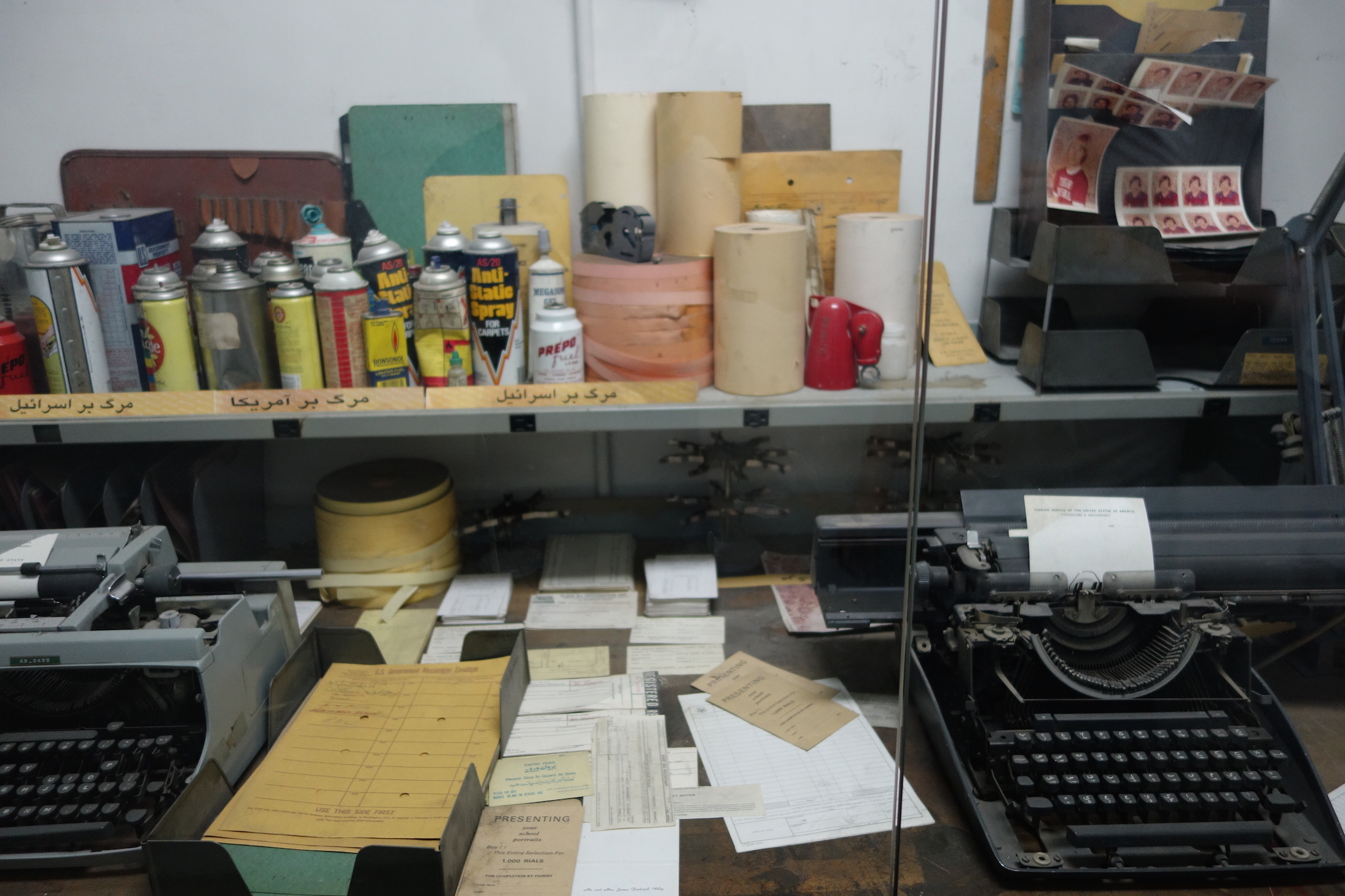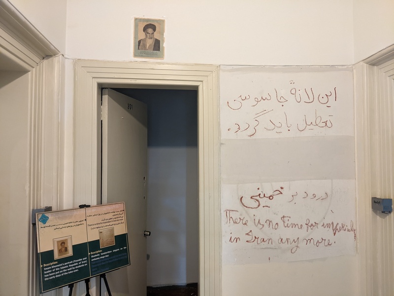 فمع صعود الدرج، الذي يزينه رسومات جرافيتي تصور بالونات الأمم المتحدة، كلب ينبح، نجوم وخطوط مشتعلة، رجل يهودي ذو أنف كبير، وعين العناية الإلهية، ترى ما يعرضه المتحف من وثائق وممتلكات صودرت عام 1979، بما فيها معدات وآلات تجسس، وأوراق ممزقة حاول الرهائن تدميرها أثناء عملية احتجازهم، وقد حُوِّل بعضها إلى كتب. كما يُظهر الغرف العازلة للصوت التي استخدمها الدبلوماسيون الأمريكيون كمخابئ ربما.