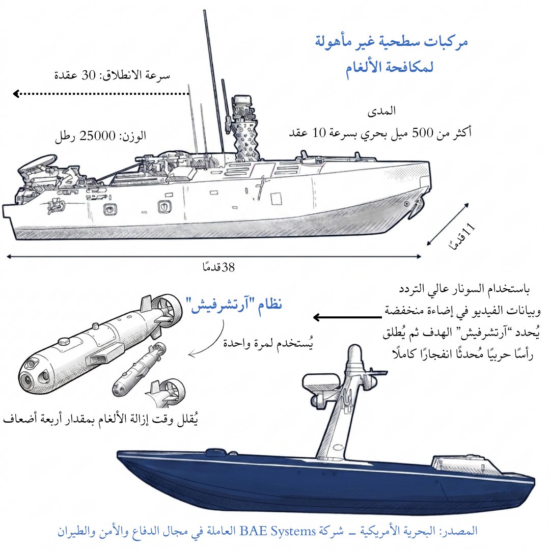 ولعل أبرز تلك المركبات هي غواصات "نايف فيش" (Knifefish)، و"MK18 Kingfish"، المتخصصة في مسح قاع البحر والكشف عن الألغام المدفونة تحت الرمال أو المخبأة في القاع الصخري.