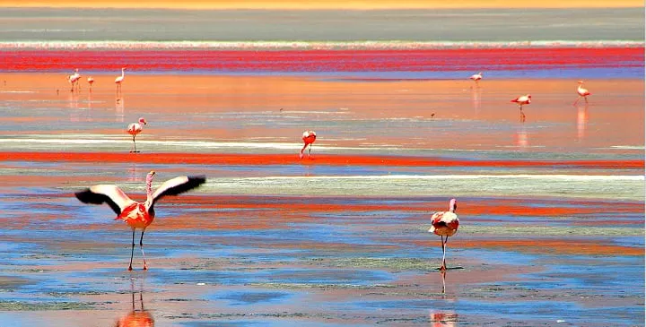 تشتهر البحيرة بلونها الوردي المائل للأحمر نتيجة الطحالب، وتقع بالقرب من الحدود مع تشيلي.