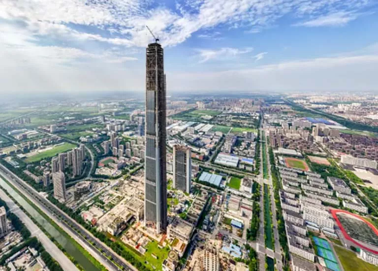 وبدأ البناء في برج جولدين فاينانس 117 عام 2008 وكان من المتوقع أن يستكمل عام 2014 ليصبح أطول مبنى في الصين، لكنه توقف في 2010 بسبب الركود الاقتصادي الكبير، قبل أن يتم استئناف البناء في 2011، لكن المبنى توقف مجددا بعد اكتمال هيكله في 2015، وظل مهجورا على مدار العقد الماضي.